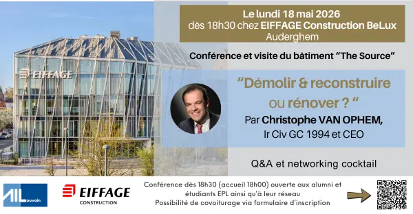 EIFFAGE CONSTRUCTION BELUX, Partenaire Premium de l'AILouvain, nous fait le plaisir de nous accueillir dans son nouveau bâtiment innovant "la Source", à Auderghem le lundi 18 mai.